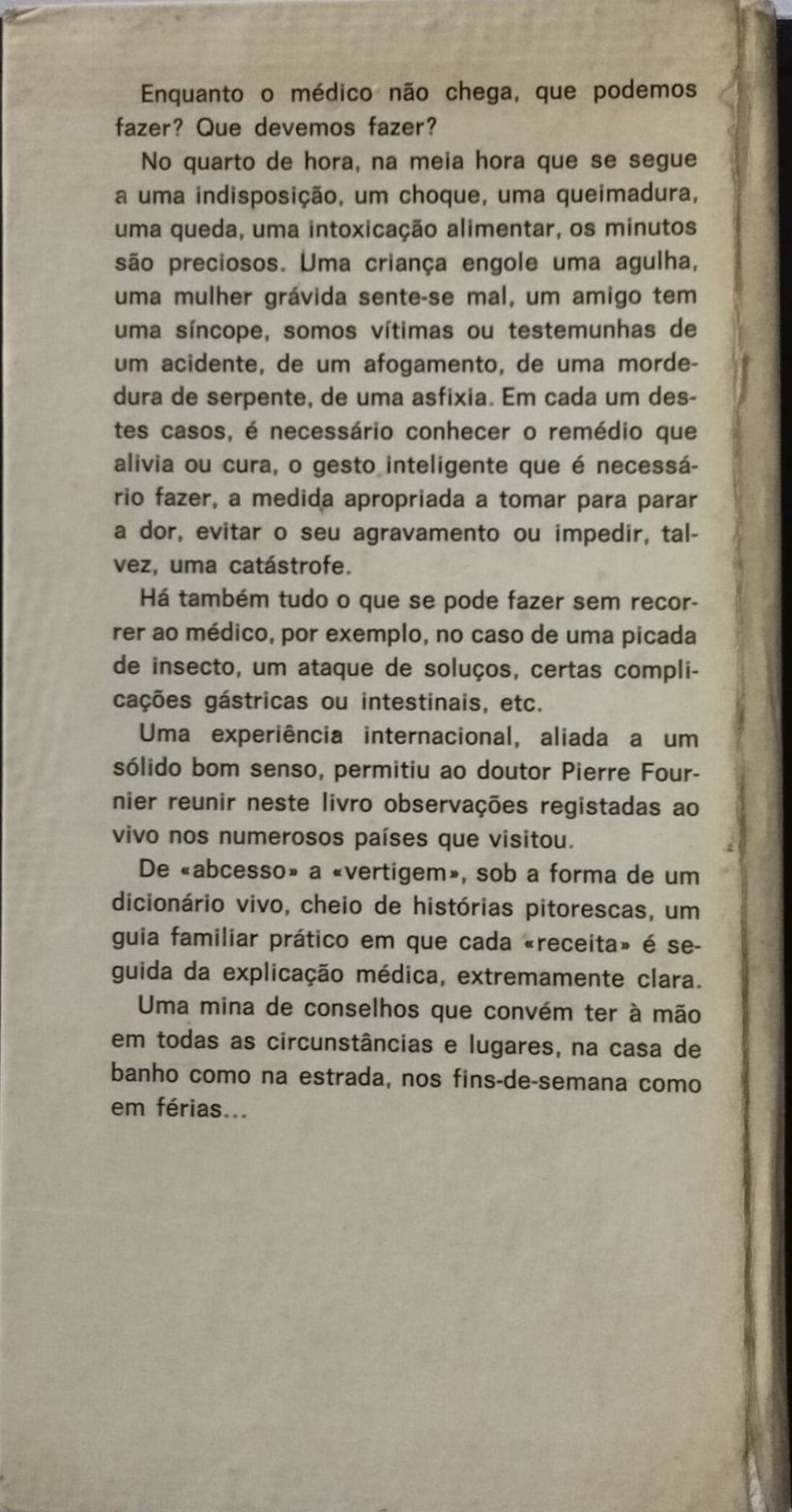 Este livro nasce de uma experiência concreta do autor enquanto médico, confrontado com situações de urgência em contextos onde o auxílio médico imediato não está disponível. A obra reúne observações práticas recolhidas ao longo de muitos anos de exercício e de viagens por vários países, apresentadas sob a forma de um guia organizado por temas, de A a Z. Cada entrada descreve situações comuns — acidentes, indisposições, doenças súbitas — e indica gestos, cuidados e medidas que podem ser tomados enquanto se aguarda a chegada de um médico. O autor sublinha repetidamente que o objectivo não é substituir o profissional de saúde, mas ensinar atitudes simples e imediatas que podem aliviar o sofrimento, evitar agravamentos e, em alguns casos, salvar vidas.