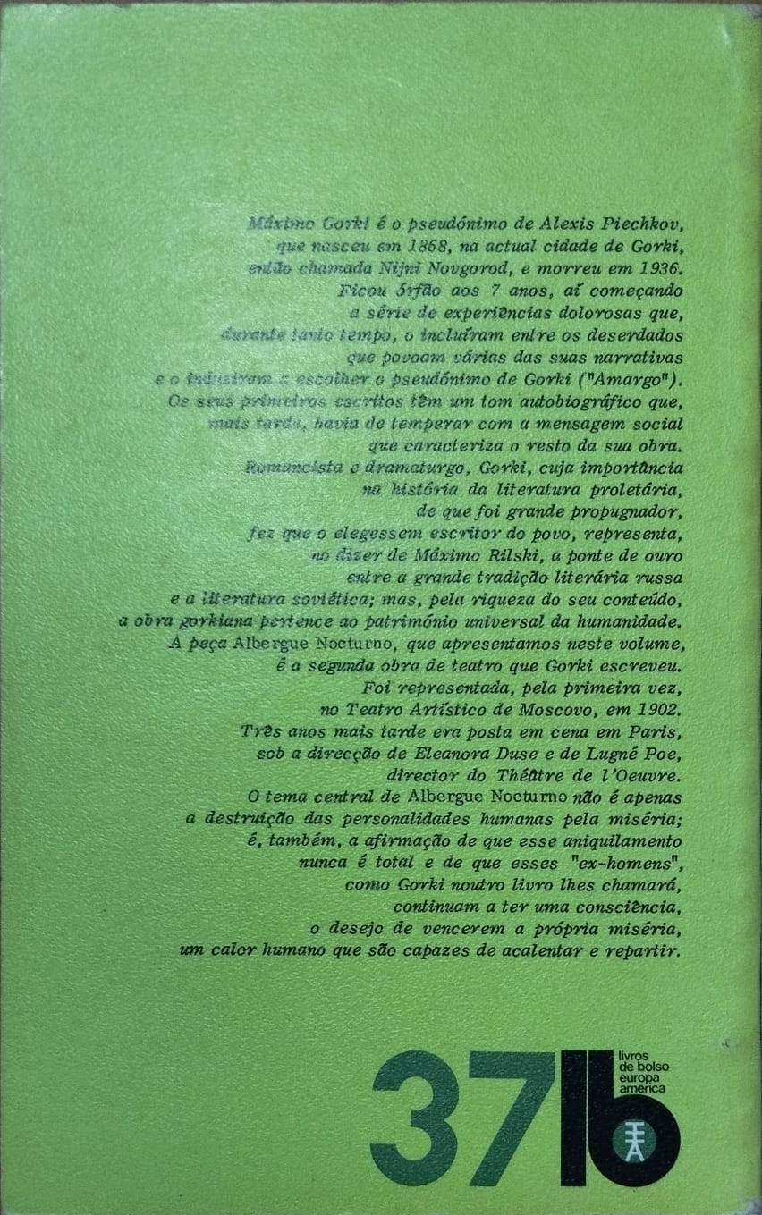 Num recanto sombrio da Rússia czarista, onde a miséria adormece lado a lado com a esperança, Máximo Gorki ergue um retrato cru e profundamente humano dos esquecidos do mundo. Em 'Albergue Nocturno', um grupo de deserdados encontra refúgio num abrigo para os sem lar, onde se cruzam histórias de queda e lampejos de redenção. Entre o desespero e o sonho, as personagens de Gorki — ladrões, prostitutas, operários, vagabundos — procuram um sentido para a existência e revelam, na sua fragilidade, uma força quase sagrada: a de permanecerem humanos mesmo quando tudo parece perdido. É um hino à dignidade e à resistência do espírito, escrito por quem conheceu a fome, a rua e a ternura das sombras.