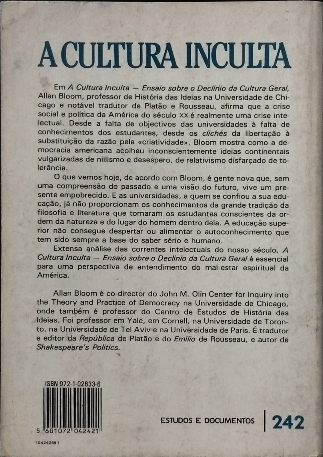 Há livros que não são apenas livros — são um espelho colocado diante da alma de uma época. *A Cultura Inculta* é um desses espelhos. Allan Bloom observa a universidade moderna com a precisão de um filósofo e a tristeza de quem vê o brilho antigo perder-se entre ruídos fáceis, comodidades intelectuais e um mundo que já não sabe perguntar «o que é o homem?».