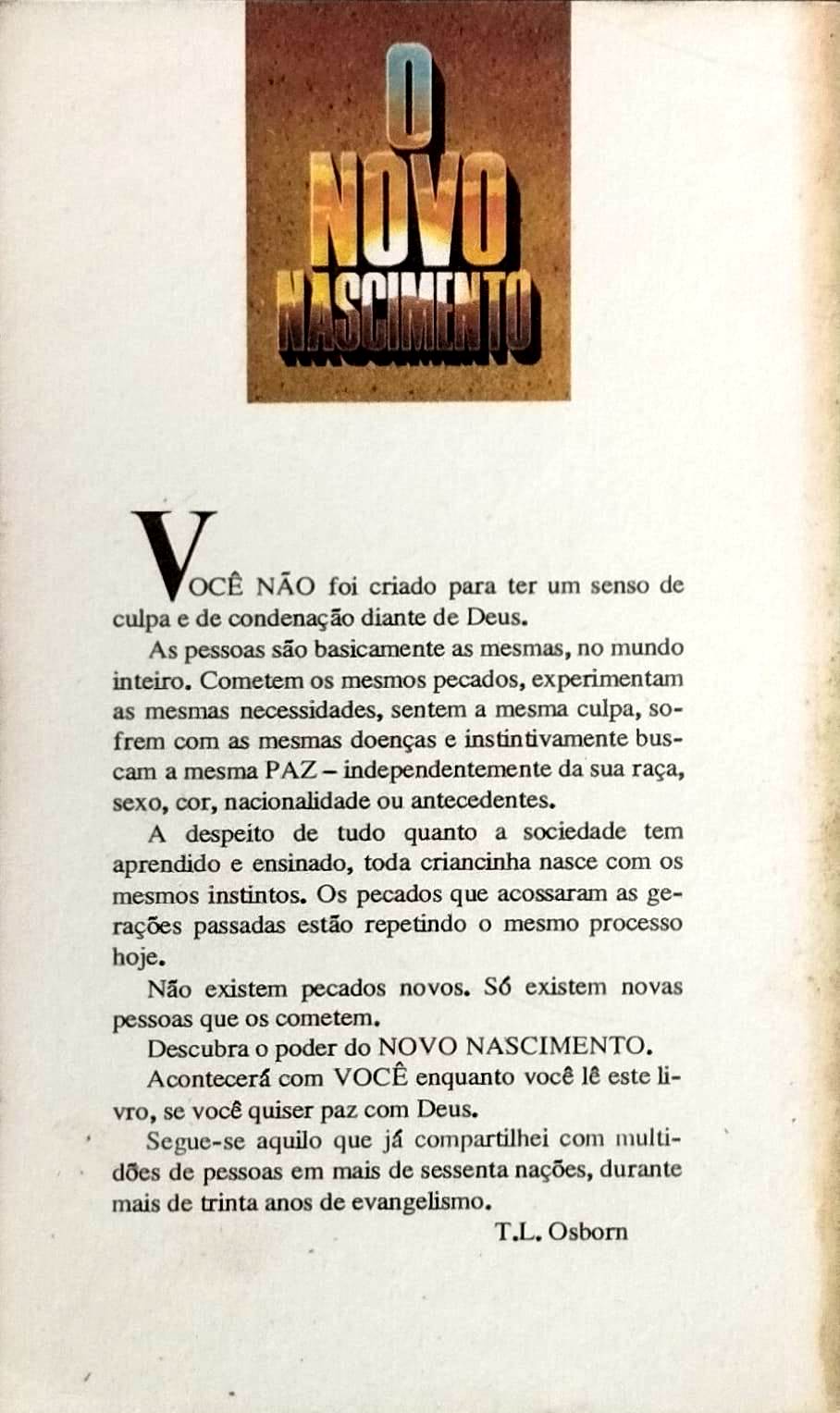 Nesta obra, T. L. Osborn expõe o conceito cristão do novo nascimento a partir das Escrituras, explicando que nascer de novo não é uma reforma exterior, mas uma transformação interior operada por Deus. O autor recorre a exemplos concretos, testemunhos e passagens bíblicas para mostrar como a fé em Jesus Cristo conduz a uma nova vida, liberta da culpa e orientada para uma relação pessoal com Deus. O livro insiste na ideia de que o novo nascimento é essencial para a vida cristã e acessível a todos os que crêem.