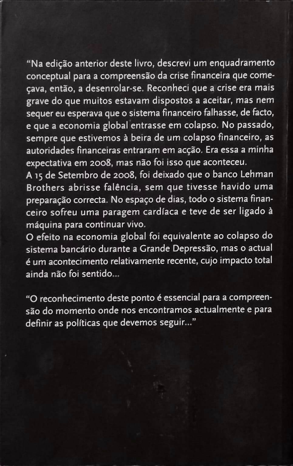 George Soros, figura incontornável dos mercados financeiros globais, reflecte sobre a crise financeira de 2008 como quem observa uma falha sísmica depois do abalo. A partir da sua teoria da reflexividade, desmonta a crença na auto-regulação dos mercados e mostra como expectativas, erros humanos e instituições interagem num ciclo de crescimento e colapso. Não se trata apenas de explicar o que falhou, mas de questionar o próprio modelo que sustentou décadas de confiança cega no sistema financeiro. Um livro lúcido, crítico e profundamente inquietante, escrito por alguém que conhece o jogo por dentro — e não finge neutralidade.