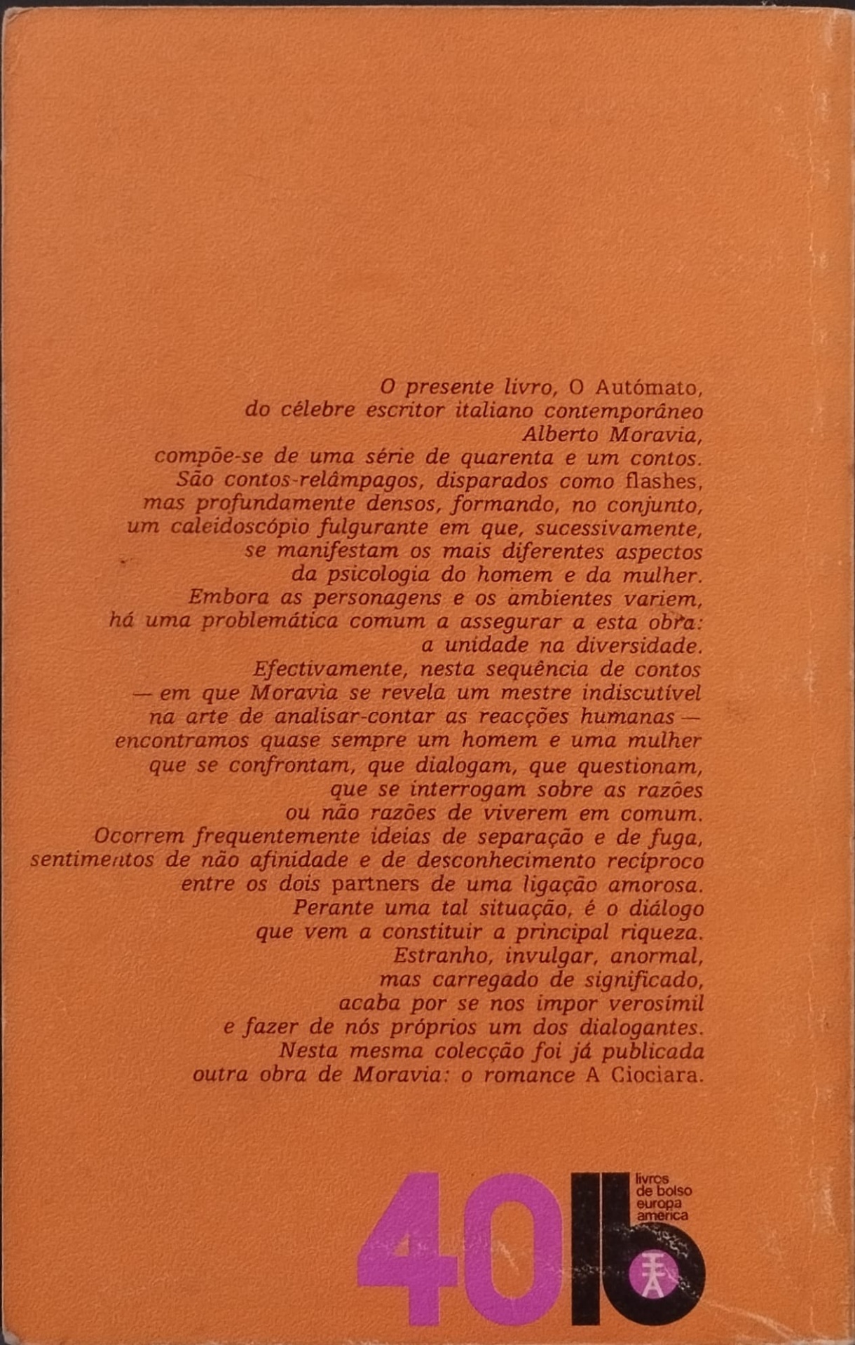 Em O Autómato, Alberto Moravia mergulha na alma humana com a precisão de quem observa o coração através de um microscópio. São quarenta e um contos — breves, intensos, quase elétricos — onde homens e mulheres se confrontam com o abismo do outro e com o vazio de si mesmos. Entre o amor e o tédio, a fuga e o reencontro, o autor constrói um espelho fragmentado onde cada reflexo é uma pergunta sobre o que nos move, o que nos prende, e o que resta quando o sentimento se transforma em mecanismo.