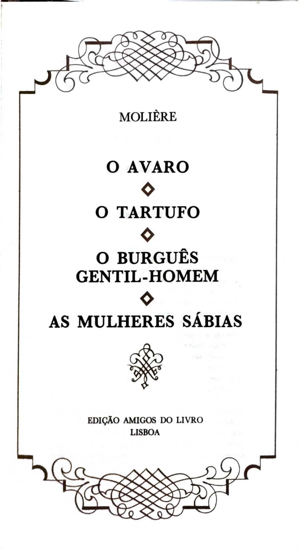 Este volume reúne quatro das mais célebres comédias de Molière, onde o riso se mistura com uma fina crítica aos comportamentos humanos. Em O Avaro, a avidez pelo dinheiro destrói afectos e distorce tudo à volta. Em O Tartufo, a hipocrisia religiosa revela o seu rosto mais perigoso. O Burguês Gentil-Homem acompanha as tentativas desastradas de um homem comum que deseja ascender socialmente, esquecendo o ridículo que provoca. As Mulheres Sábias apresenta o choque entre a simplicidade e a pretensa erudição, expondo vaidades e exageros intelectuais. Um conjunto que mostra Molière no máximo da sua acuidade e humor.